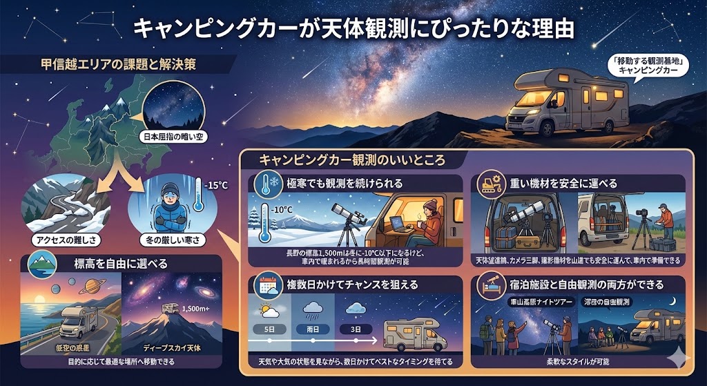 Stargazing in the five Koshinetsu/Kanagawa prefectures in 2026 requires strategic use of altitude darkness and coastal open visibility, leveraging camping car mobility and comfort as the key to success.